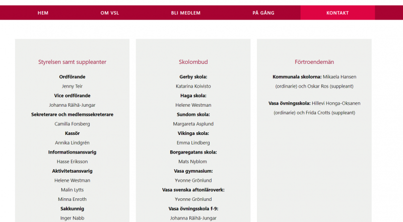 Skärmdump från webbsidan där Vasa svenska lärarförening presenterar sina skolombud.
